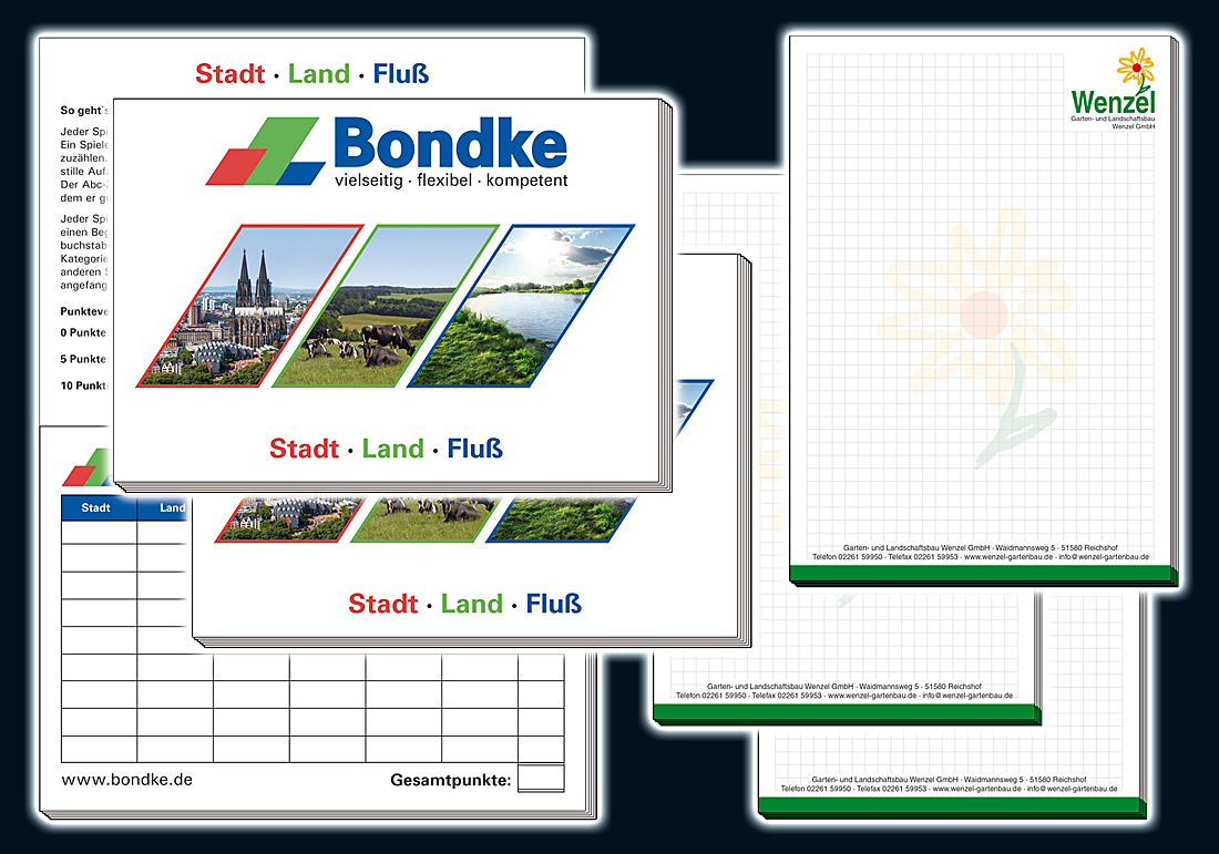 Für die Bondke GmbH haben wir einen "Stadt-Land-Fluß" Block mit Deckblatt für die Spielregeln und für die Garten- und Landschaftsbau Wenzel GmbH Notizblöcke gemacht!